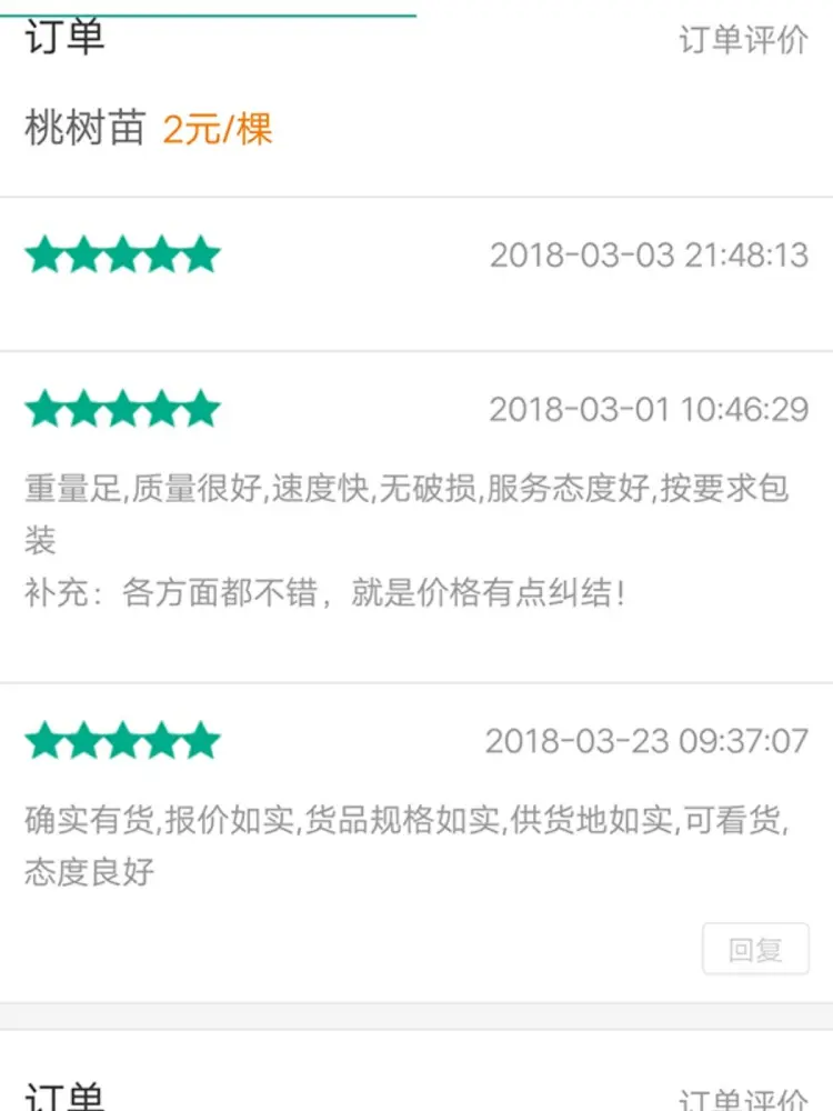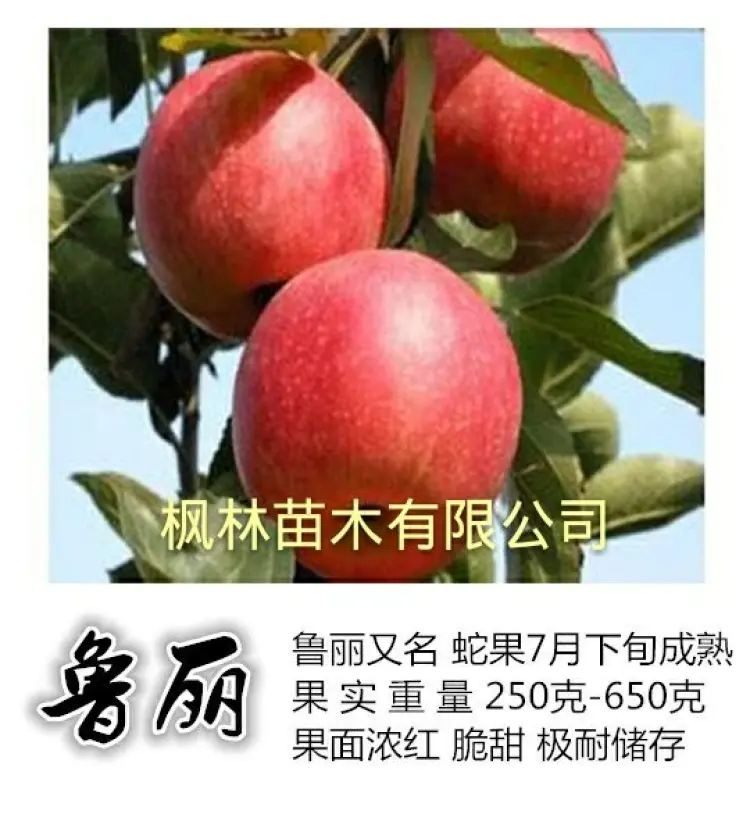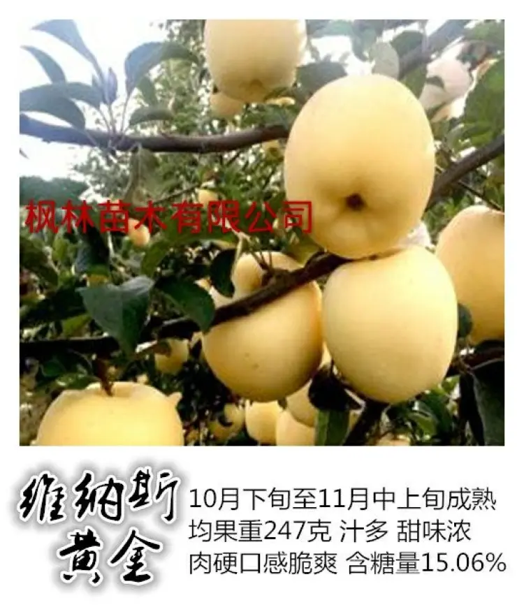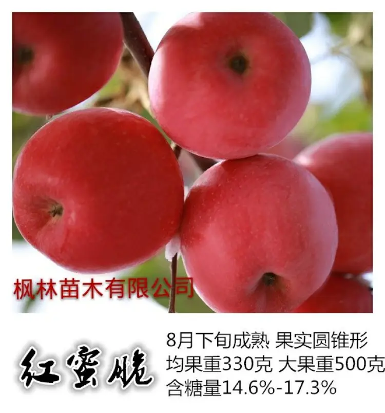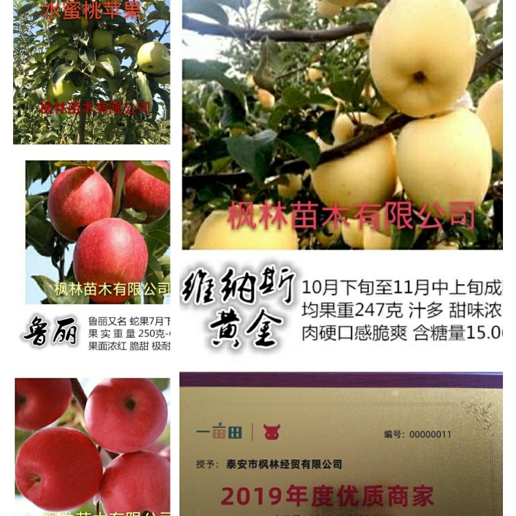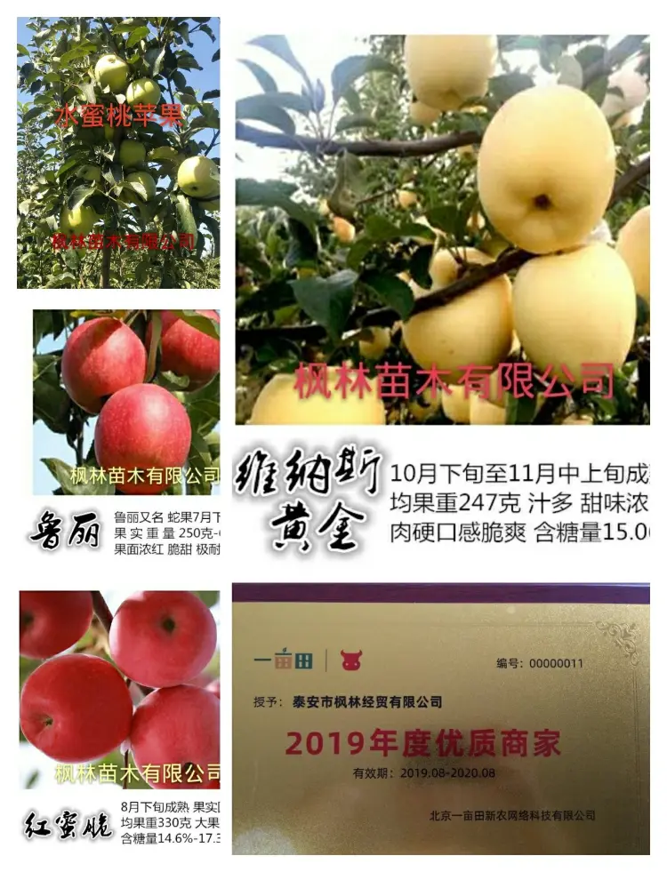 【联系我时,请说是在一亩田上看到的】 [联系我时,请说是在一亩田上看到的] [高度]100cm以上,发时可以修剪 [粗度]直径0.8~1.5公分(嫁接口2公分处量) [成活率]95%以上 [苗龄]1年苗 [纯度]99%以上 [冠幅]40cm [类型]嫁接成品苗 [品种特点]水蜜桃苹果种植简单 种植3年挂果,5年丰产 经济效益高。 [栽种时间]霜降后栽植和开春栽培都可以。 [适种区域]南北方都适合,种植土地不能存水,必须及时能排水。 [技术指导]常年免费提供技术,种植管理资料。 [快递物流]圆通、顺丰和中通快递,铁运和空运,也可直接配车。 [公司介绍]泰安枫林经贸有限公司是专业果树种植和新品种育苗基地,拥有20年培育果苗和管理果园的成熟经验其中采集新品种果树示范园100亩,育苗面积每年达到200亩土地,每年供应各类果树嫁接苗200万棵,所有种苗保证品种、保证质量、可签合同开发票 [本人承诺]我承诺顾客在一亩田下单后,3天内按时发货,并能保证做到种苗的成活率和纯度。