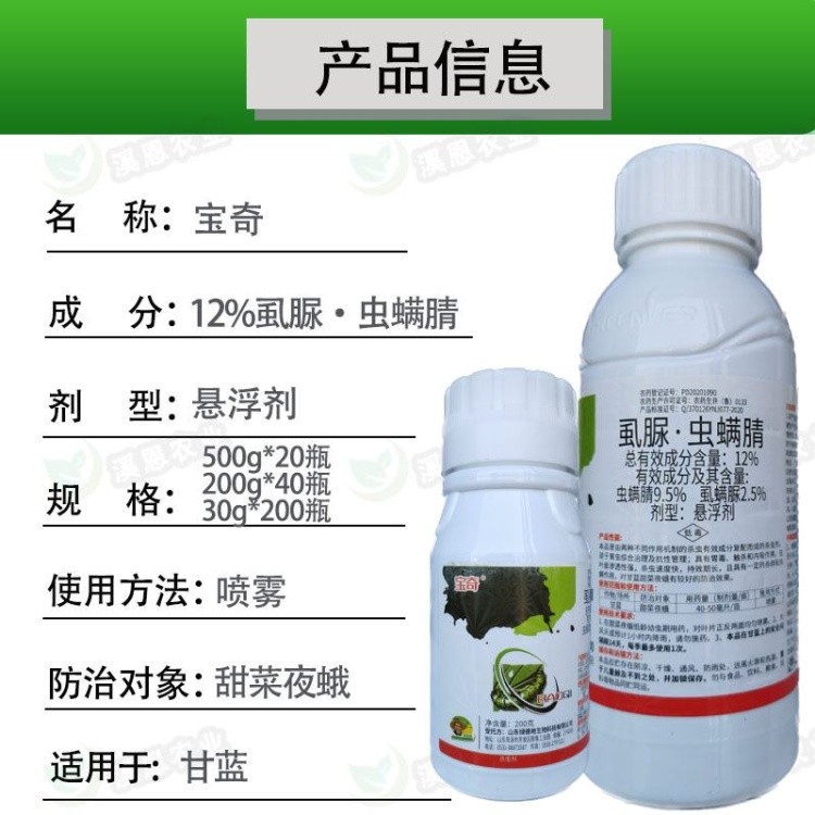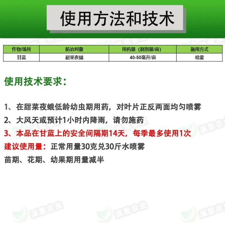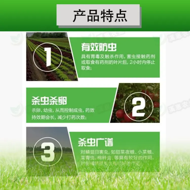 【联系我时,请说是在一亩田上看到的】 本品是由两种不同作用机制的杀虫有效成分复配而成的杀虫剂,适于害虫综合治理及抗性管理;具有胃毒、触杀和内吸作用,在叶面渗透性强,杀虫速度快,持效期长,且具有一定的杀卵和杀螨作用,对甘蓝甜菜夜蛾有较好的防治效果。