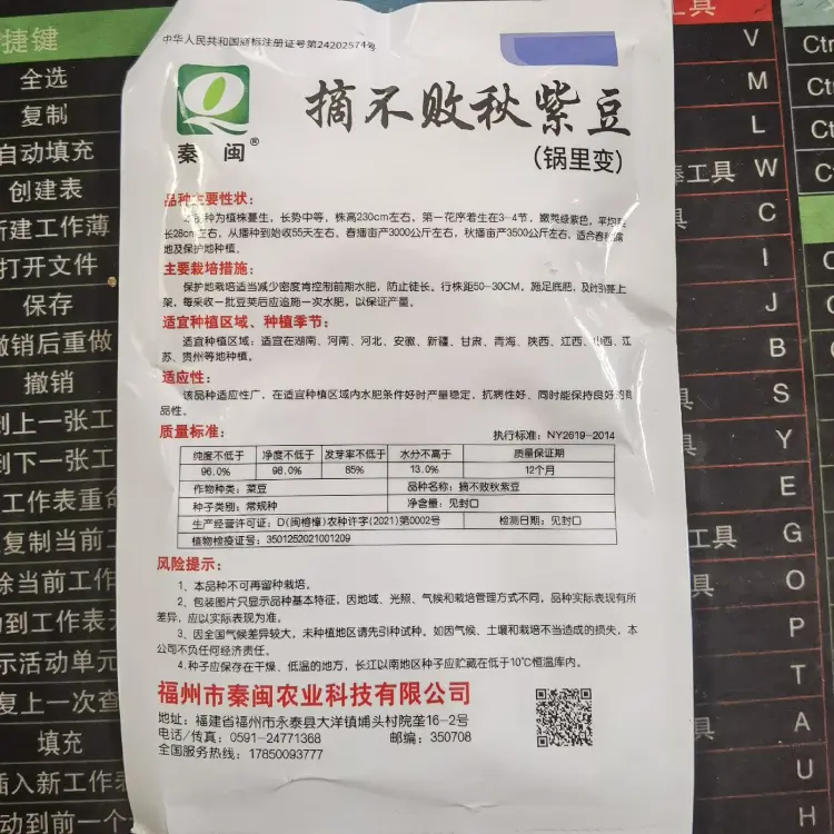 【联系我时,请说是在一亩田上看到的】 品种主要性状: 种为植株蔓生,长势中等,株高230cm左右,第一花序着生在3-4节,嫩荚绿紫色,平均す。长28cn左右,从播种到始收55天左右。春播亩产3000公斤左右,秋播亩产3500公斤左右,适合春利露地及保护地种植。 主要栽培措施: 保护地裁培适当减少密度肯控制前期水肥,防止徒长。行株距50-30CM,施足底肥,及时引蔓上 架,每采收一批豆莱后应追施一次水肥,以保证产量。 适宜种植区域、种植季节: 适宜种植区域:适宜在湖南、河南、河北、安徽、新疆、甘肃、青海、陕西、江西、小西、江苏、责州等地种植。 适应性: 该品种适应性广,在适宜种植区域内水肥条件好时产量稳定,抗病性好、同时能保持良好的商 品性。