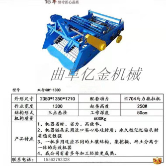 【联系我时,请说是在一亩田上看到的】 本厂生产的机器,通过调换不同筛网可替代花生收获机,红薯收获机等薯类收获机使用,本机有不同的筛网选择,用户可根据当地土质及土壤干湿程度行调换筛网。 本公司可根据用户需求定做各种尺寸的机器,一定客户满意。 使用配套大型四轮拖拉机经悬挂,传动轴连接,开动机器,根据药材根茎深度调节后轮,缓慢将深铲插入土壤中。将药材根茎挖出,经振动筛振动将土筛净后,使药材传送地表面,完成采挖工作